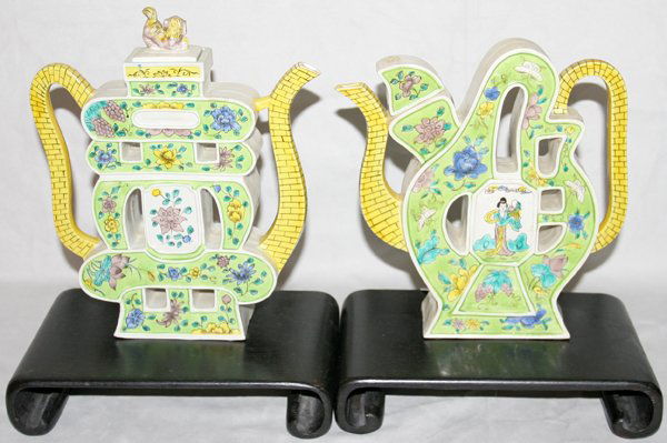CHINESE CALLIGRAPHY PUZZLE TEA POTS, PAIR,