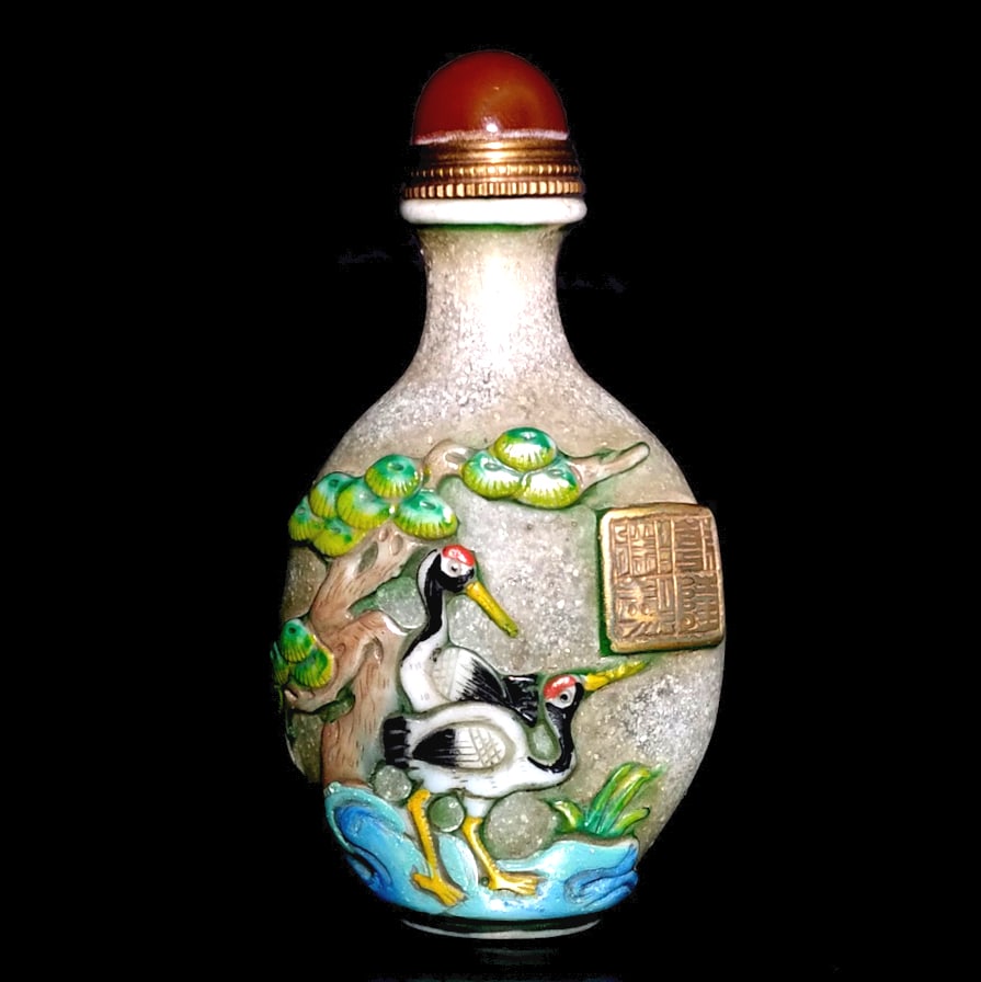CHINESE CARVED ENAMELED PEKING GLASS SNUFF BOTTLE STORKS QIANLONG SEAL