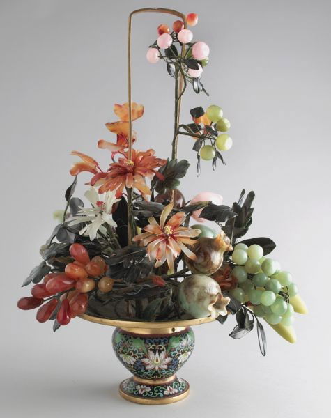 SoldLarge Chinese Carved Hardstone Tree in PlanterLarge Chinese Carved Hardstone Tree in Cloisonne Planter of a fruiting pomegranate in Crystal, Agate, Serpentine, etc. Good condition, with small chips. Heigt wih Planter 20 1/4 inches (51.5 cm.).See Sold Price