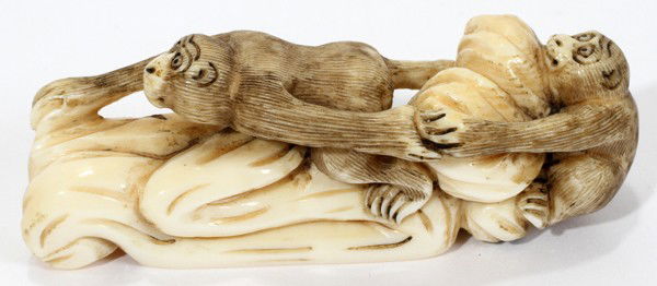 CHINESE CARVED IVORY NETSUKE, MONKEYS ON ROCKS,