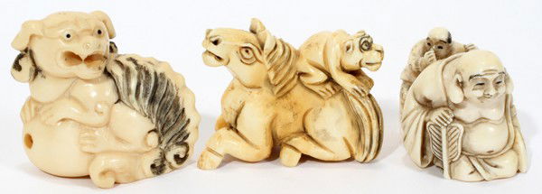 CHINESE CARVED IVORY NETSUKE, THREE, H 1"