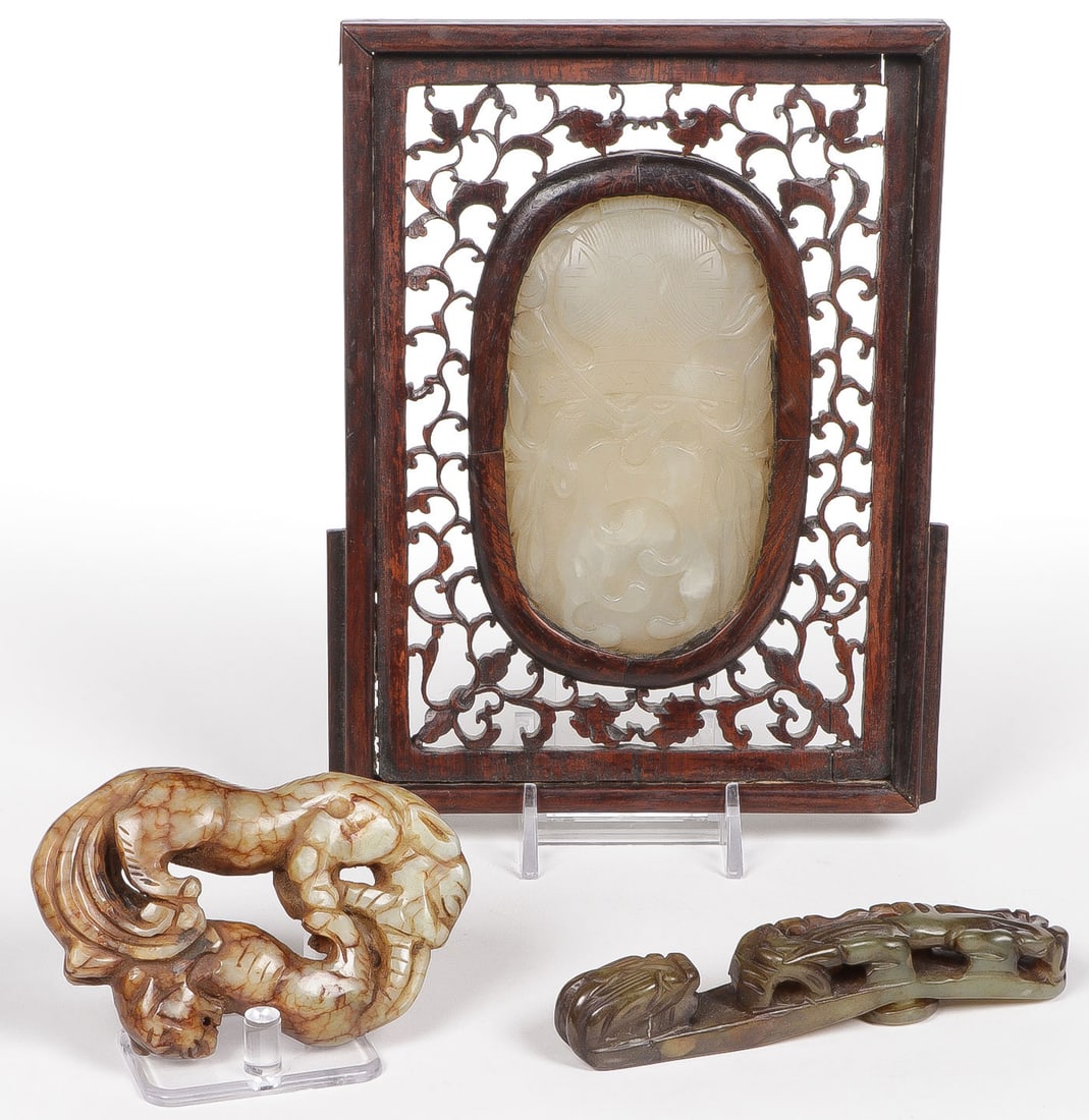 SoldCHINESE CARVED JADE GROUPCHINESE CARVED JADE GROUP Comprising a pair of delicately carved jade dragon decorated hair pins, greatest length 8 inches (20 cm), a finely carved jade pendant of leaf form with opposing creatures, lSee Sold Price