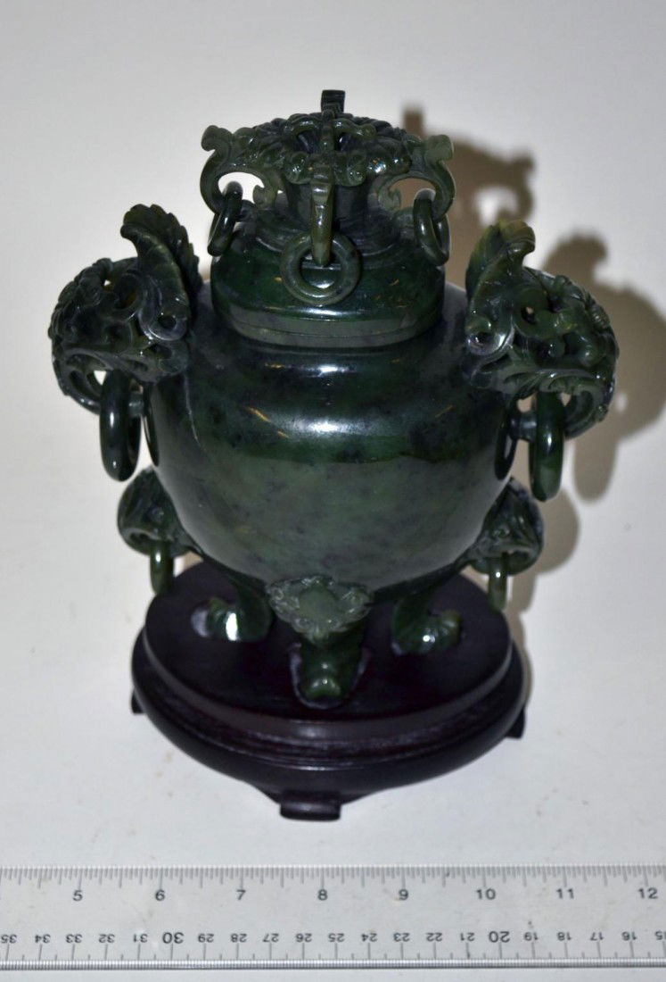 Chinese Carved Spinach Jade Censor on Stand