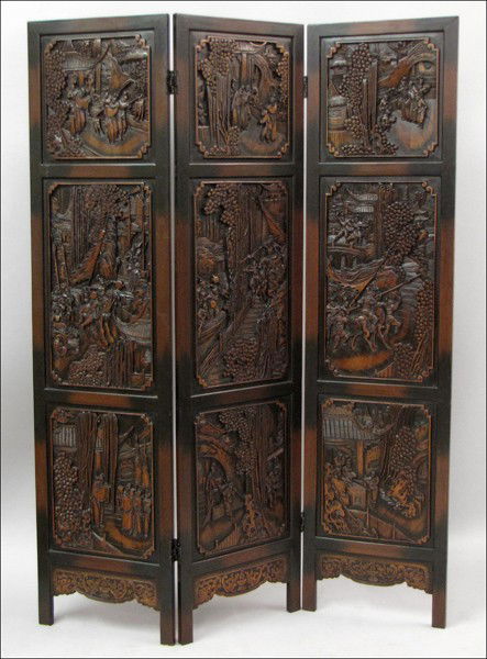 CHINESE CARVED WOOD THREE-PANEL SCREEN.