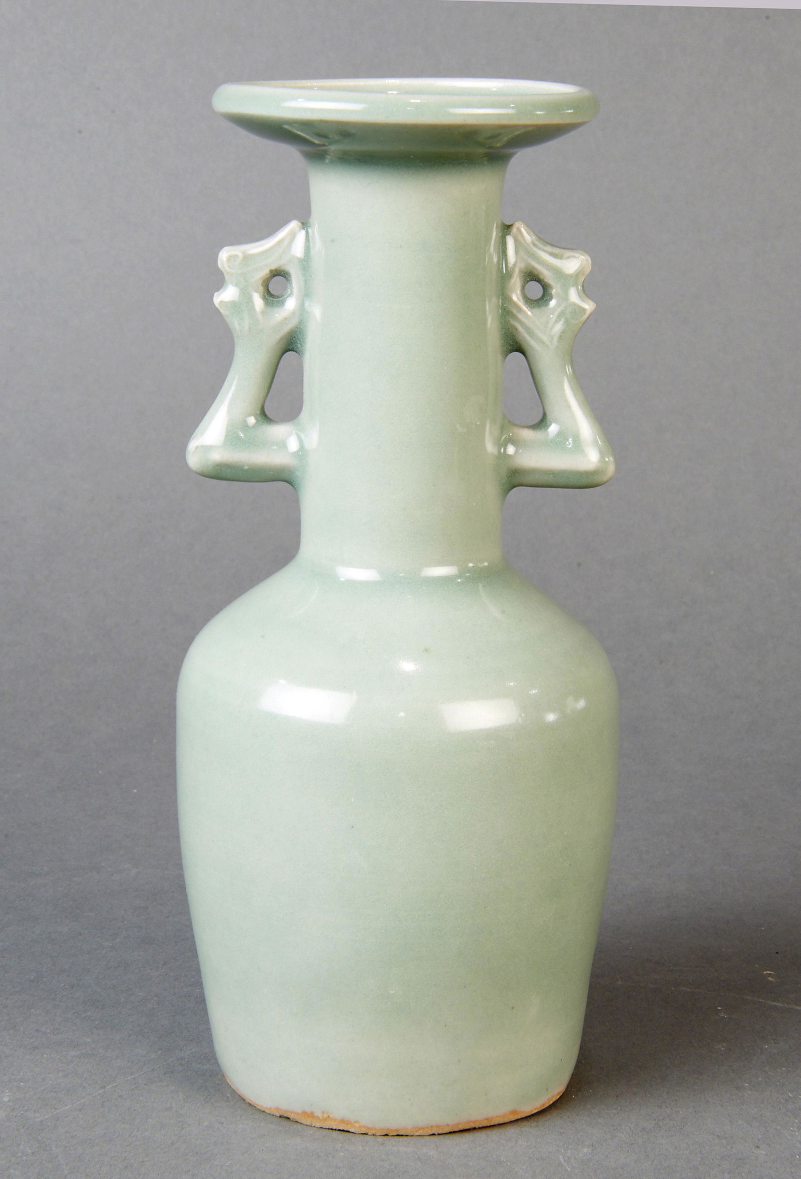 SoldA Longquan Celadon Glazed Porcelain Mallet VaseA Longquan Celadon Glazed Porcelain Mallet Vase Ming Dynasty (1368-1644) 明 龍泉青釉鳳耳盤口瓶 having a sea-foam green glaze throughoSee Sold Price