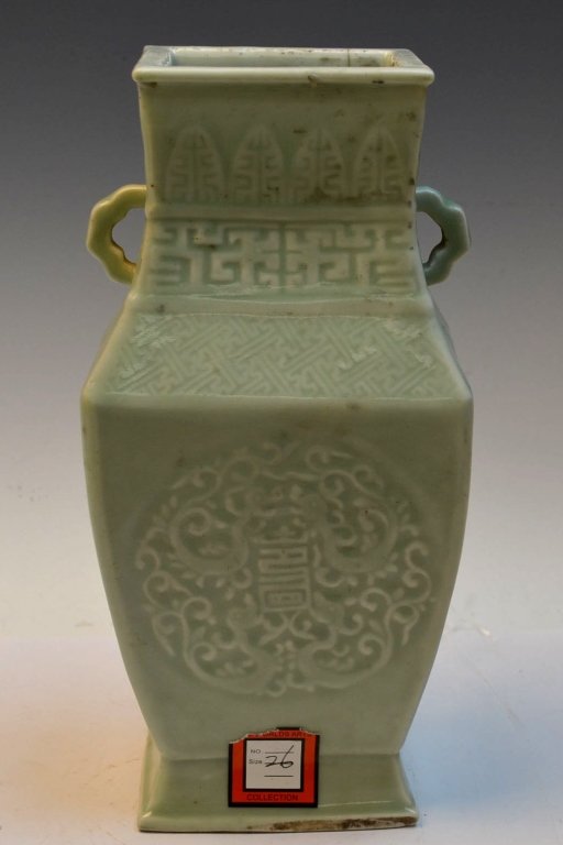 SoldChinese Celadon Rectangular Porcelain VaseChinese celadon rectangular porcelain vase depicted with low-relief dragons. The eight of this vase is 10-1/2 in.See Sold Price