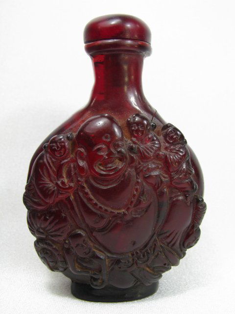 CHINESE CHERRY AMBER SNUFF BOTTLE W/ BUDDHA