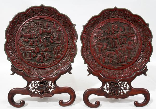 CHINESE CINNABAR/CARVED LACQUER DISCS, PAIR,
