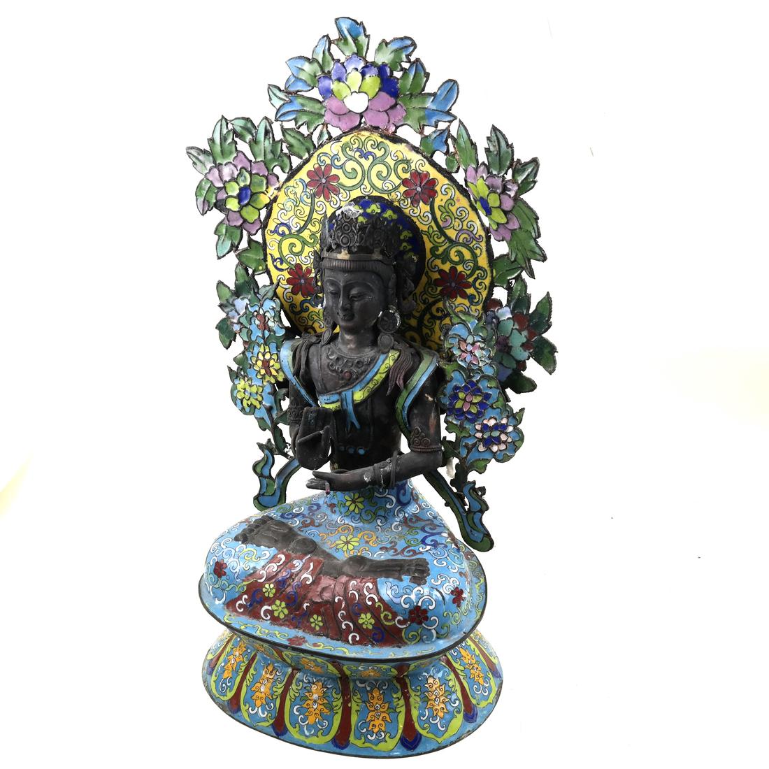 SoldChinese bronze cloisonné buddha with raised leg, 15"h xChinese bronze cloisonné buddha with raised leg, 15"h x 11"wSee Sold Price