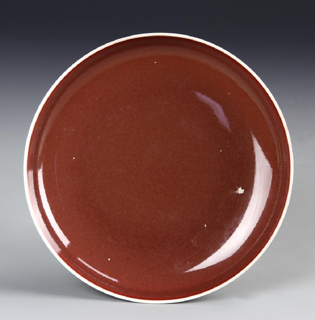 SoldChinese Copper Red Glaze Porcelain Platewith six character Guangxu mark to the underside. 2" high, 8 3/4" diameter. Provenance: Property of a Pennsylvania Private Collector.See Sold Price