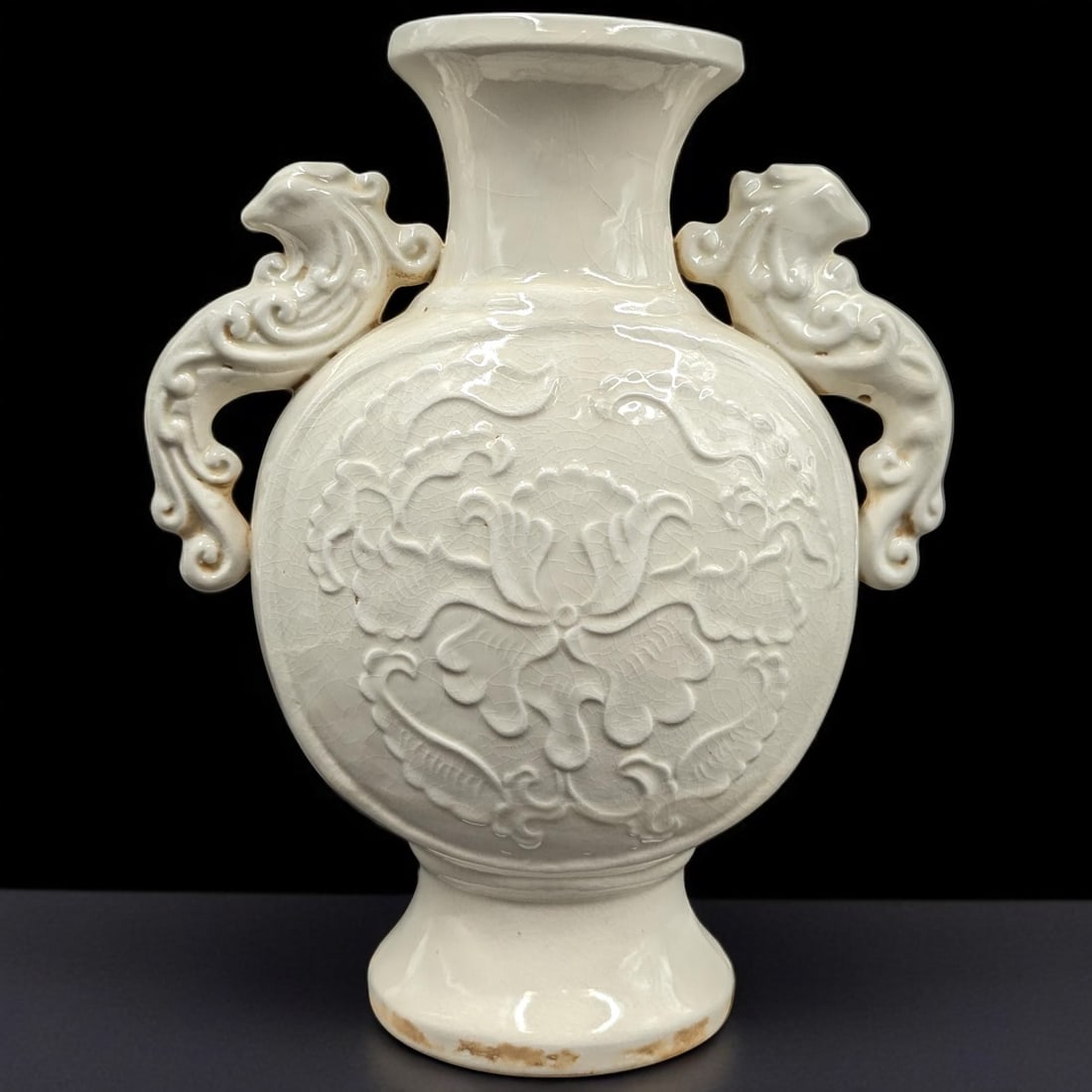 SoldChinese Ding Yao VaseChina, Northern Song Dynasty, Ding Yao ware Vase, fluted rim, decorated with a dragon wrapped around neck, raised leaves and medallions around the body with central dragons. Height 12 1/4 in. ProvenSee Sold Price