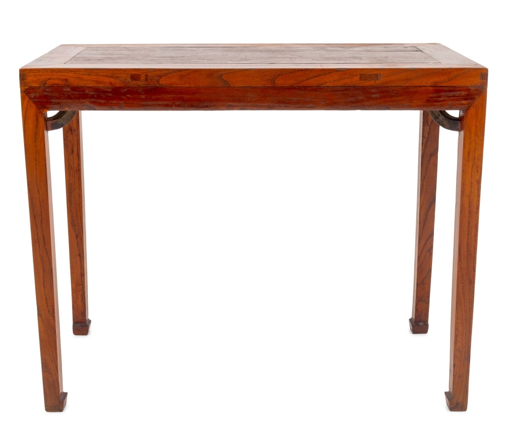 SoldAntique Chinese Elmwood Table.Antique Chinese Elmwood Table. Applied scrolled skirt. 33"h. x 66"w. x 28-3/4"d. Condition: Good with minor wear and restorations.See Sold Price