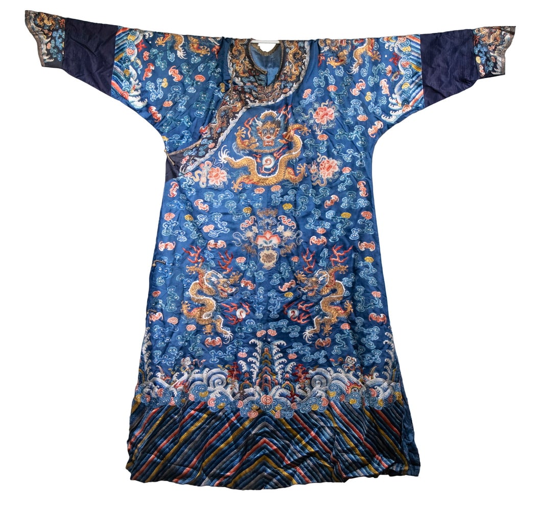 Late Qing Dynasty, Red Satin Jifu Robe with Gold-Thread Embroidered Five-Clawed Dragons2 days LeftA Chinese blue-ground embroidered dragon robe, 19th centuryMar 22, 2026A Fine Qing Stone-Blue Brocade Changfu Robe Woven with Round Dragon MedallionsMar 08, 2026A Fine Qing Stone-Blue Satin Embroidered Jifu RobeMar 08, 2026A Chinese blue-ground gold-thread embroidered dragon robe, 19th centuryMar 22, 2026A Fine Qing Treasure-Blue Robe EmbroideredMar 08, 2026A Fine Qing Treasure-Blue Satin Embroidered Jifu RobeMar 08, 2026A Chinese dark-blue-ground embroidered gauze dragon robe, early 19th centuryMar 22, 2026Fine Chinese Silk Embroidery Dragon RobeMar 28, 2026A CHINESE IMPERIAL EMBROIDERED DRAGON ROBEMar 08, 2026Chinese Silk Dragon Robe with EmbroideryFeb 28, 2026A Chinese blue-ground gold-thread embroidered dragon robe, 19th centuryMar 22, 2026Chinese Tri-Blue Court RobeMar 28, 2026A CHINESE EMBROIDERED DRAGON ROBEMar 08, 2026Court robe China, Qing dynasty, 19th century106 Lots AwayAntique Chinese Kesi Silk Dragon Robe2 days Left