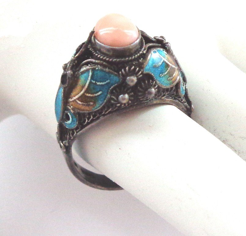 Chinese Enamel Silver Coral Ring