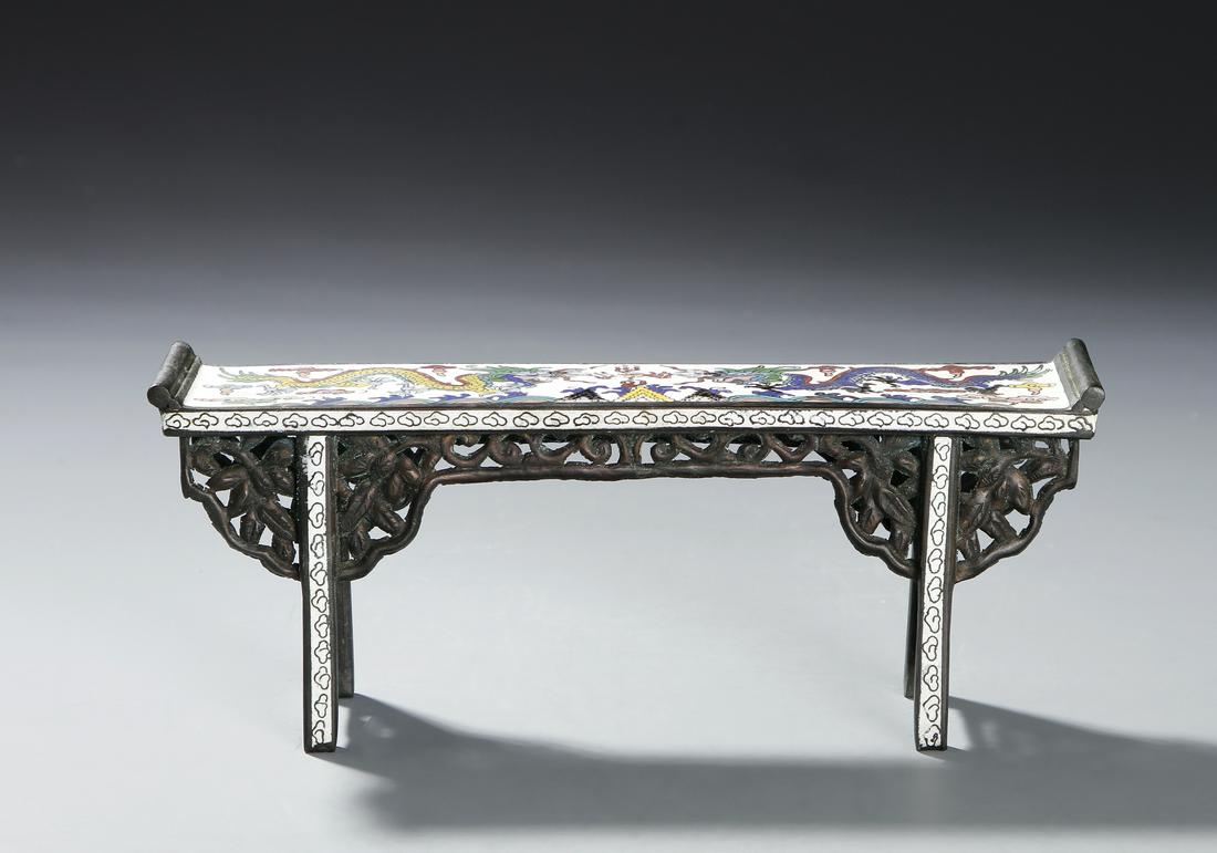 SoldDIMINUTIVE CLOISONNE ALTAR TABLEDIMINUTIVE CLOISONNE ALTAR TABLEChinese, late 19th/early 20th century, enameled metal. Altar table form brush rest/stand, yellow and white five-claw dragons to the top.3 1/8 x 7 5/8 x 1 3/4 in. (7.9 xSee Sold Price