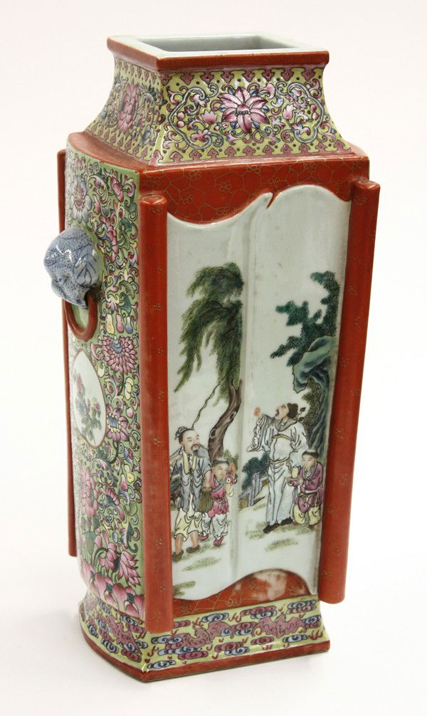 Chinese Enameled Rectangular Vase, Figural Scroll