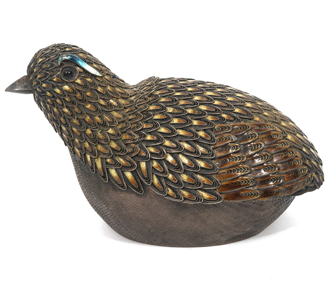 Fine Antique Chinese Silver & Enamel Box w/ StonesMar 18, 2026A pair of Chinese enamelled gilt-silver quail-form boxes and covers, 19/20th C.Mar 18, 2026Two Chinese enamelled filigree silver mandarin duck-form boxes and covers inset with preciousMar 18, 2026A Superb Pair Of Cloisonne Quail-Form CensersMar 14, 2026Chinese 19th C Cast Bronze "Quail" Incense BurnerMar 15, 2026A Chinese Cloisonne Enamel Duck Effigy, 20th Century, 75YC23 hrs LeftAn Exquisite Cloisonne Duck-Form BoxMar 11, 2026Iron Red Gilt Porcelain Duck Tureen with Carved Hardwood StandMar 13, 2026An Exquisite Bronze Inlaid Gold and Silver Bird Ornament6 days LeftAn Exquisite Silver Rooster OrnamentMar 24, 202619c Chinese bronze champleve DUCK INCENSE BURNERA GILT SILVER FILIGREE ENAMELLED PHOENIX ORNAMENT5 days LeftRoyal Crown Derby Paperweight, Partridge3 days LeftPre-Ming Dynasty Gold and Silver Inlaid Duck-Form Incense Burner693 Lots AwayRoyal Crown Derby Dappled Quail Paperweight3 days LeftAntique Chinese Enameled Silver Phoenix StatueMar 10, 2026