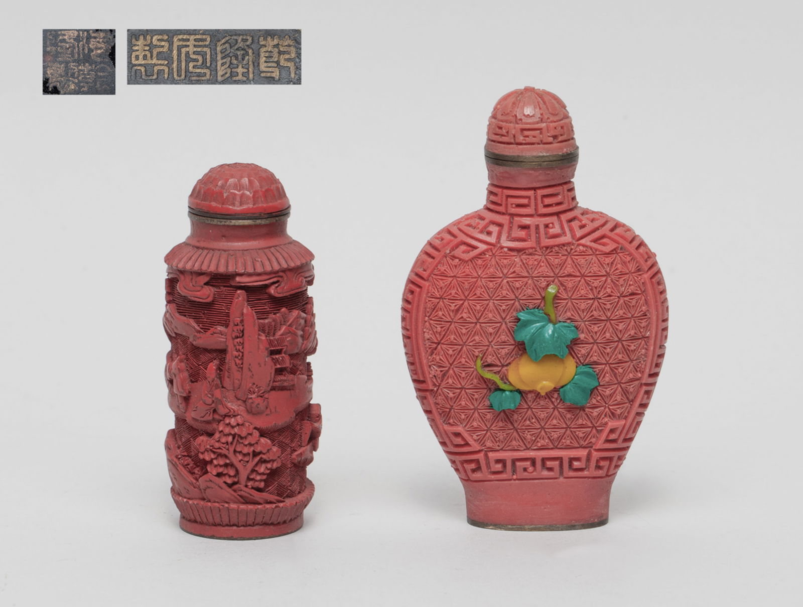 SoldChinese Cinnabar Snuff BottlesQing - Republic era cinnabar snuff bottles decorated with court scenes, all marked. (3) bottles. Largest 2.5"hSee Sold Price