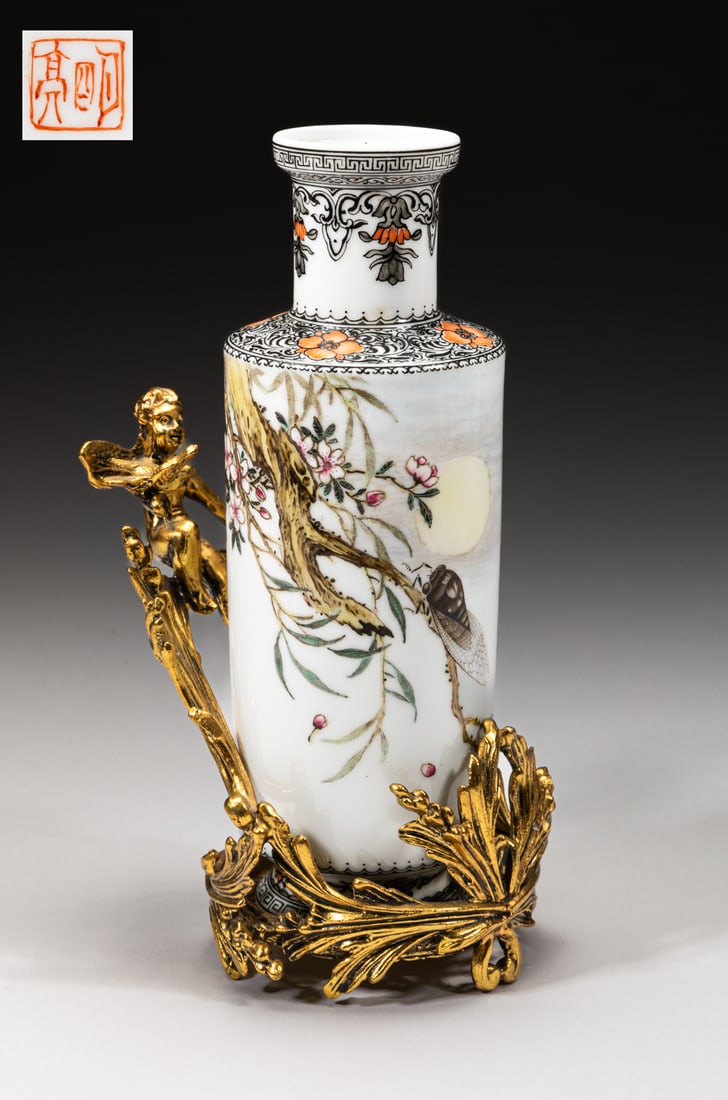 SoldChinese Export Porcelain Vase with Metal DecorThe vase exterior painted with mountain landscape scene, set with a pair of angel form metal handles and a metal base, the bottom with a seal mark. Approx. 16-9 inch.See Sold Price
