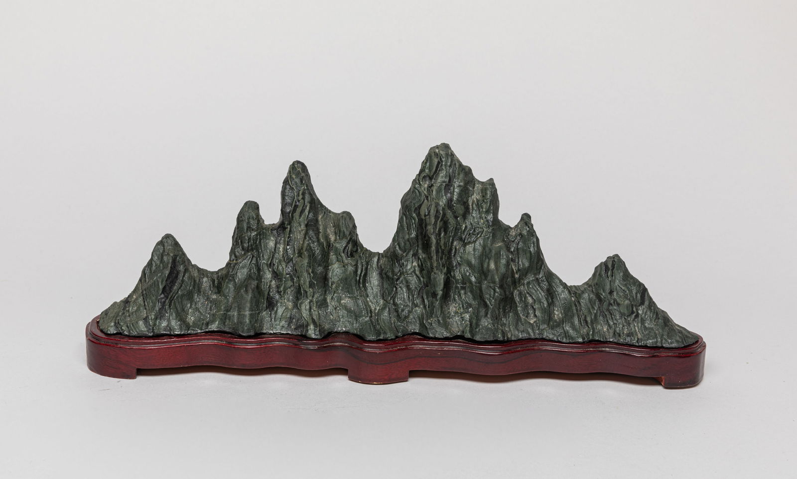 SoldChinese Export Scholar StoneOf horizontal orientation, the rock formation in the shape of a mountain range, with stand. Approx. 12*3.8*1.5 inch (w/ stand).See Sold Price
