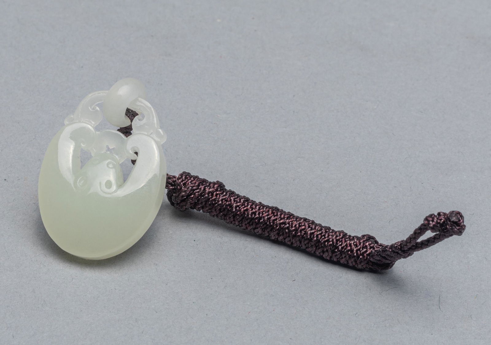 SoldChinese Export White Jade CarvingCarved with two beasts clambering around an oval-shape plaque with tail crossing the central aperture, with an agate bead. Approx. 2.4-1.5 inch.See Sold Price