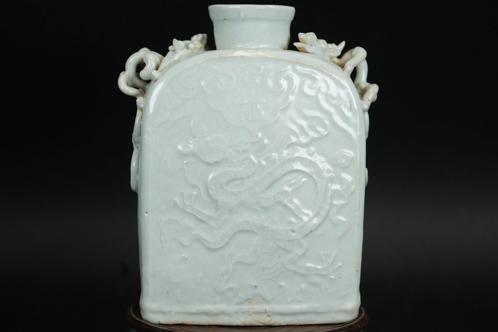 SoldChinese moon flask vase, Xuande markChinese porcelain moon flask vase, the cobalt blue ground reverse-decorated with a writhing five-claw dragon amidst cloud forms, the recessed base with a band of lapping waves moulded in low relief, tSee Sold Price