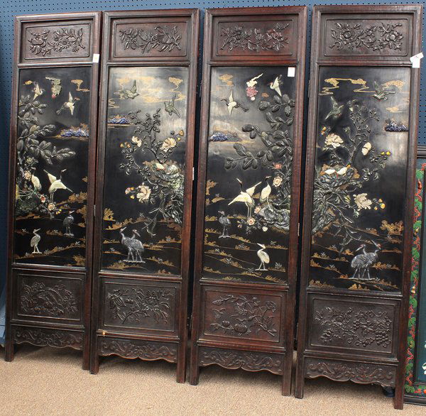 Chinese Four Panel Stone Overlaid Screen, Cranes