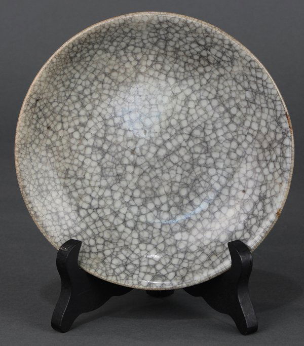 SoldChinese 'Ge-Type' Porcelain Bowl DishOf round form, rising from slight tapering foot, covered overall in a lustrous silky glaze of grayish-blue tone, suffused with a fine network of golden-beige crackles, Ming dynasty, 20 cm D.See Sold Price