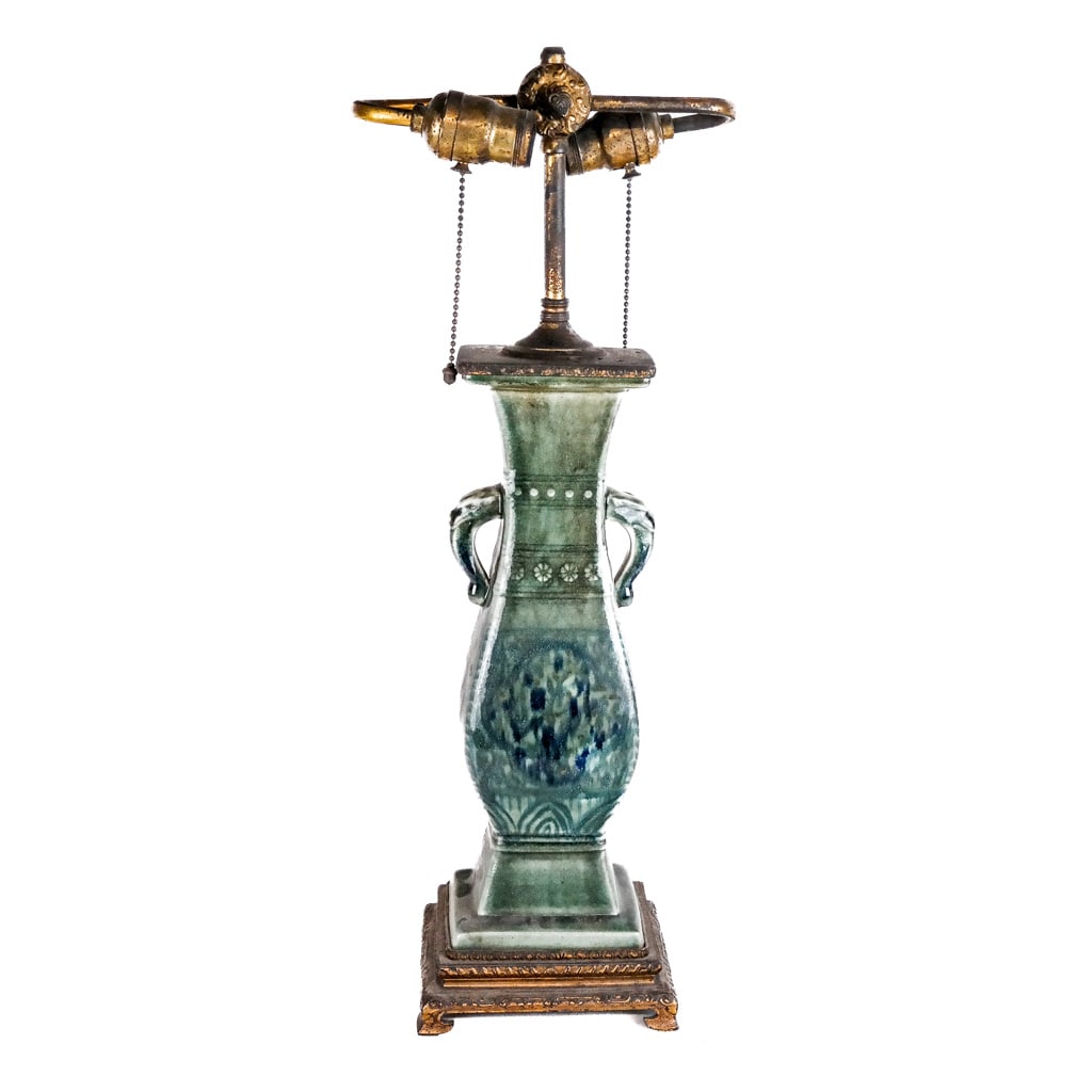 SoldRare Exceptional Fulper Chinese Glazed Vase LampArts & Crafts Scarce Exceptional Fulper Chinese Glazed Pottery Ceramic Double O Ring Handled Vase Mounted Lamp Art Deco Sculptural table lamp by Fulper Pottery consisting of two ring handles Lamp hasSee Sold Price