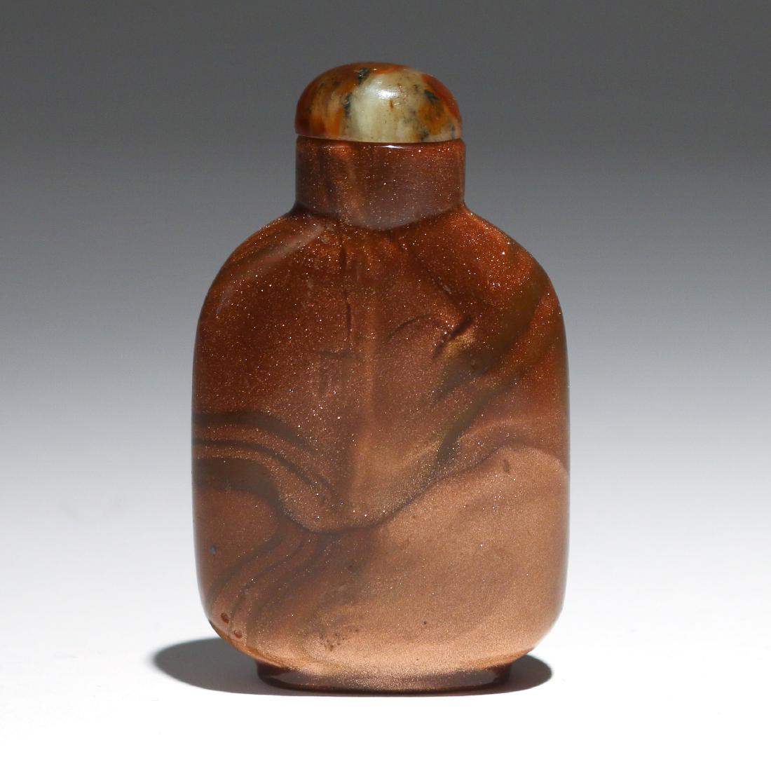 Sold(2pc) CHINESE SNUFF BOTTLESIncluding a Chinese goldstone snuff bottle, unadorned, with similarly matched agate / quartz stopper (h. 2-3/4 in.); plus a Chinese inside-painted snuff bottle, both sides painted with lions in landscSee Sold Price