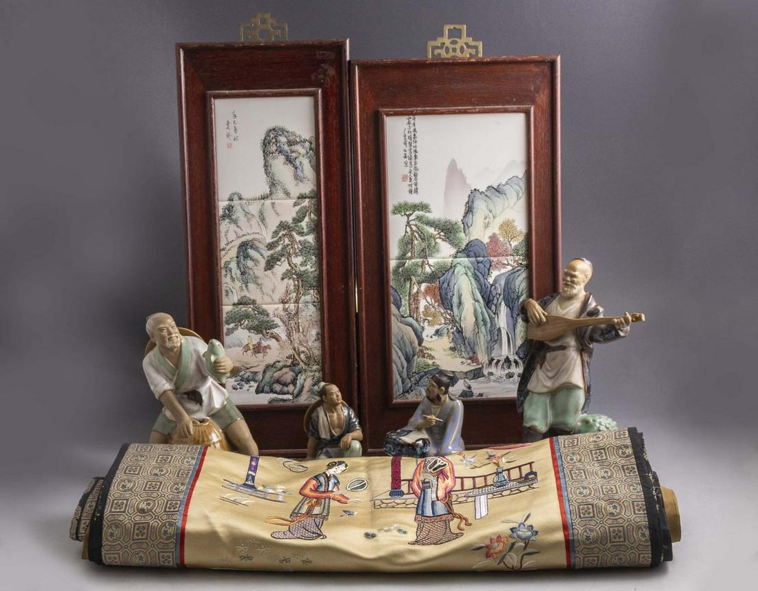 Estate Lot of 10 Chinese Porcelain Figural Statues 6" to 13" Qing 1880-1930'sMar 15, 2026A QIANJIANGCAI PORCELAIN PLAQUE INLAID ANNATTO-WOOD TABLE SCREEN2 hrs LeftA Set of Four Chinese 'Four Arts' Paintings, Signature Zhang Zhao7 days Left4 Decorative Chinese Wall Panels With Artistic Scenes, 47"h x 18"w3 days LeftA Chinese lacquered wooden table screen with jade and cloisonné, and a pair of wall panelsMar 19, 2026An exquisite zitanwood inlaid with jasper, gold inlaid with gems, landscape and figures patternApr 07, 2026Jiang Ziya scroll, exquisite ivory scroll, hand-painted silk landscape painting23 hrs LeftA SET OF FOUR ZITAN WOOD AND LACQUER WALL SCREENS INLAID WITH GEMSTONES AND POEMS, QIANLONG PERIOD,Mar 15, 2026Qiu Ying's exquisite ivory scroll, hand-painted on silk (featuring a scene of listening to the23 hrs LeftChinese Fuxing, Luxing & Shouxing PorcelainsMar 15, 2026A Chinese ink-painted biscuit porcelain table screen, Republic periodMar 22, 2026Group of Asian/Misc. Decorative ArtsAn Exquisite Wucai Lotus?Dragon and Phoenix Pattern OrnamentApr 07, 2026Pair of Chinese Porcelain Figures6 days LeftSet of Famille - rose Porcelain Plaque Table Screen with Landscape Patterns and Hat Stands10 hrs Left