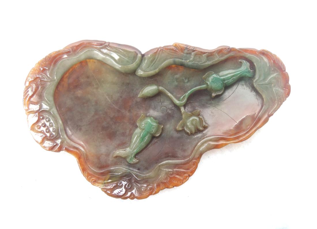 SoldChinese jadeite jade carved fish lotus pond scene brush washer4.3 inches length. 280 grams.See Sold Price