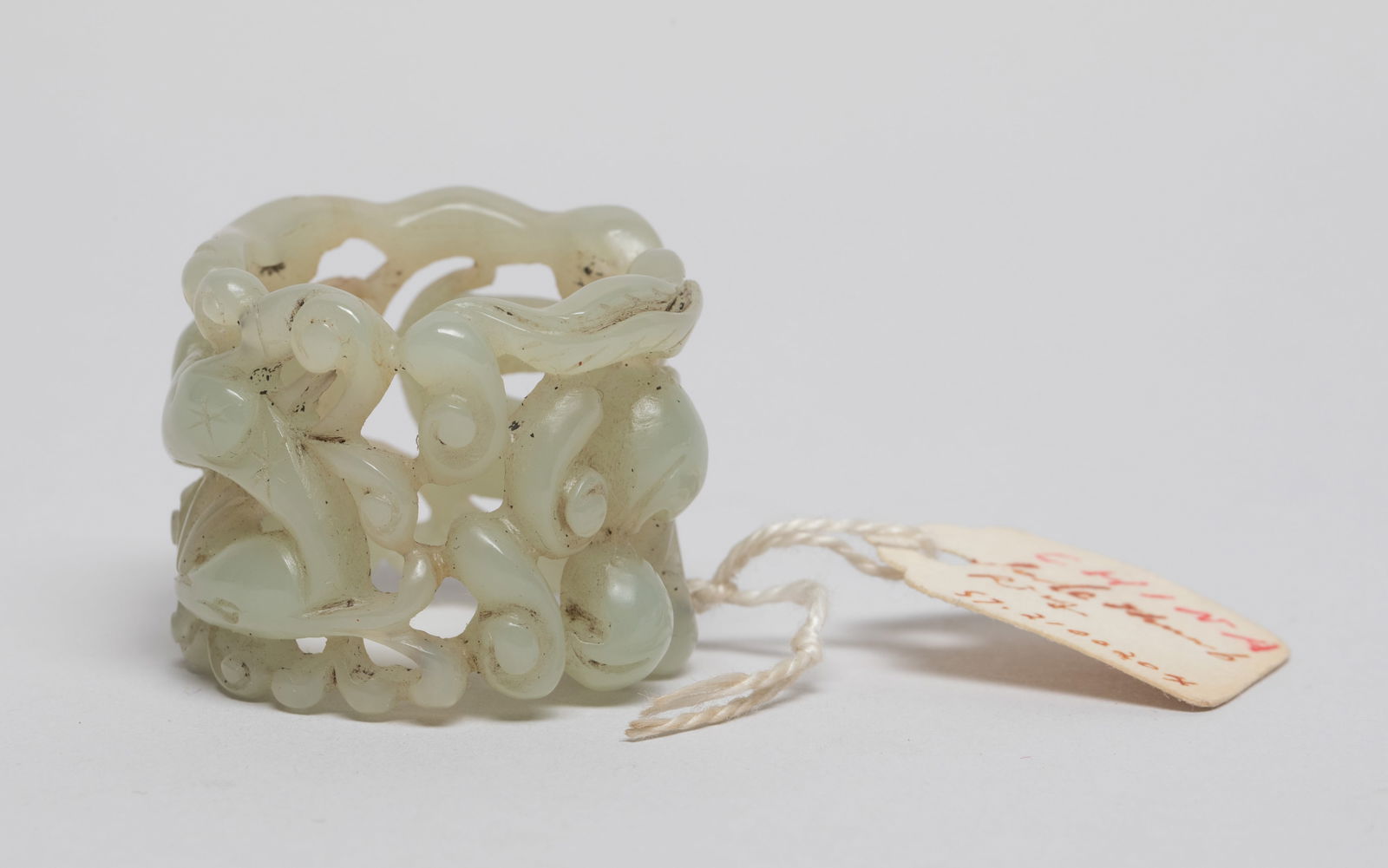 SoldChinese Jade Carved Thumb RingChinese pale celadon jade thumb ring, carved in openwork with deer and peaches among scrolls. Approx. 1.35*1 inch.See Sold Price