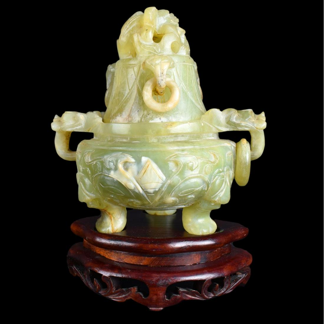 SoldChinese Carved Jade Incense BurnerA Republic Period censor, with beast head ring handles, tripod feet, cover with dragon carved in full relief. Fitted to wood stand. Total ht. 9.75".See Sold Price