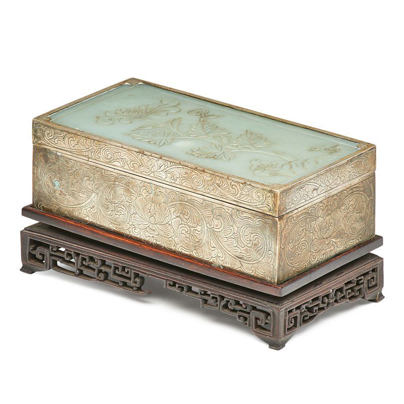 A Ming Dynasty silver-gilt inlaid jade incense boxFeb 28, 2026A Precious Gilt-Bronze Silver White Jade-Inlaid 'Bird& Flower' BoxMar 06, 2026A Large Chinese Lacquer Box with Hardstone Inlay3 days LeftAn Exquisite Zitanwood Inlaid Boxwood Flower and Bird Pattern Cover BoxMar 04, 2026A Exquisite Gilt Bronze Inlaid White Jade Lotus Pattern Flower and Bird Pattern BoxMar 18, 2026An Exquisite Zitanwood Inlaid White Jade Flower and Bird Pattern BoxMar 07, 2026Japanese Parcel Gilt Metal Chrysanthemum Decorated Metal Box c1900Mar 15, 2026A FINE MOTHER-OF-PEARL INLAID 'QILIN' SEAL CHEST AND STAND, GUANPIXIANG, QING DYNASTYMar 12, 2026A Qing Dynasty copper-gilt jade jewelry boxMar 07, 2026Chinese rose wood treasure box Qing dynastyFeb 25, 2026An Exquisite Cloisonne Inlaid White Jade Lotus Pattern BoxMar 13, 2026Qing Jiaqing Period Gilt-Bronze Dragon-Pattern Round Box6 days LeftAn Exquisite Zitanwood Flower Pattern Cover Box,with poemMar 04, 2026Chinese Jade Mounted Rosewood Covered BoxApr 14, 2026Antique Chinese Brass and Jade Stamp Box 20sAN 18TH CENTUIRY GOLD MOUNTED AGATE SNUFF BOX14 hrs Left