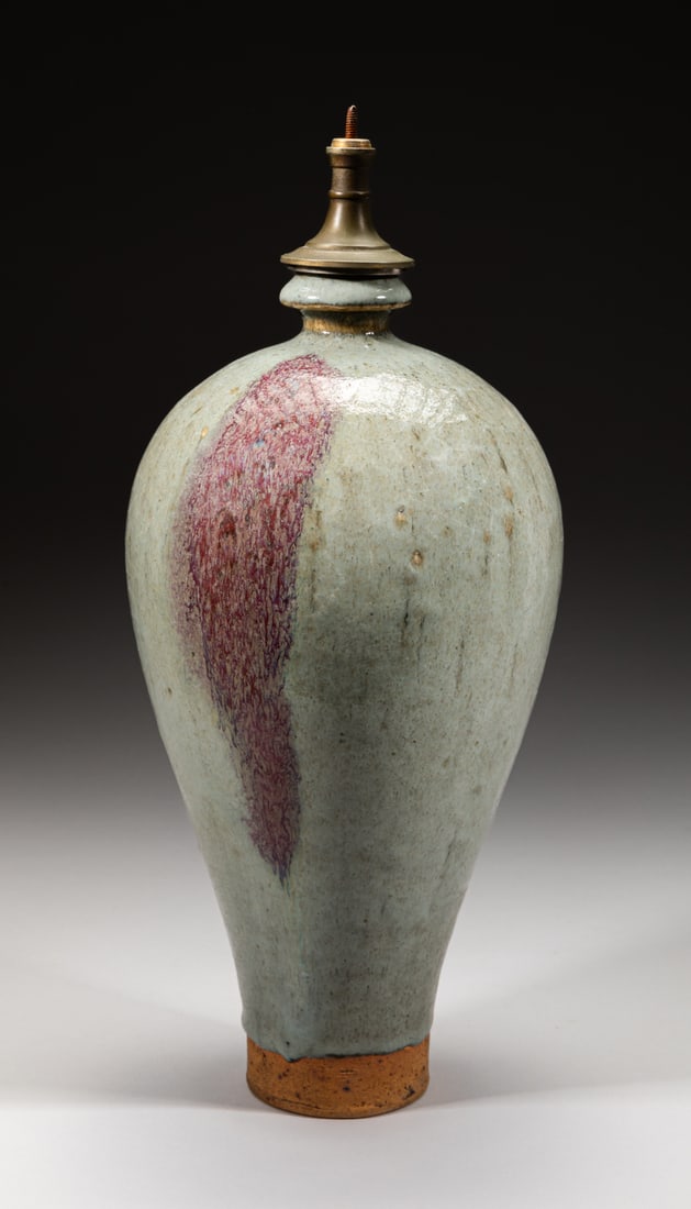 SoldChinese Jun Ware Porcelain VaseThe vase of elongated ovoid form, the exterior covered in bluish gray glaze with purple splashes, set with four small loop handles below the rim, the glaze stop at the bottom. Approx. 11.8-5.3 inchesSee Sold Price