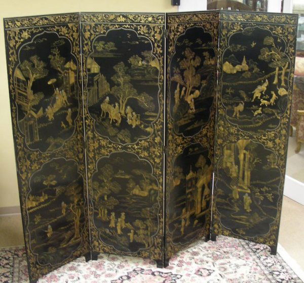 CHINESE LACQUERED GILT DECORATED 4 PANEL SCREEN