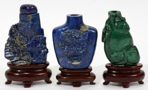 CHINESE LAPIS & MALACHITE SNUFF BOTTLES, THREE