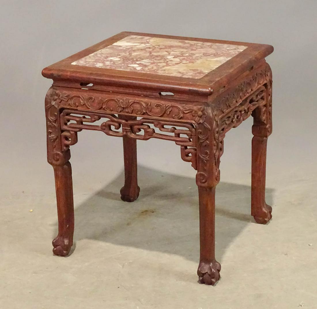 SoldCarved Chinese Marble Top TableCarved Chinese hardwood table, with marble inset top. 17"W x 17"D x 26 1/4"H. Chips to edges of marble top, chip to carving on one leg, legs loose, splits to wood at top, splits to wood on legs.See Sold Price