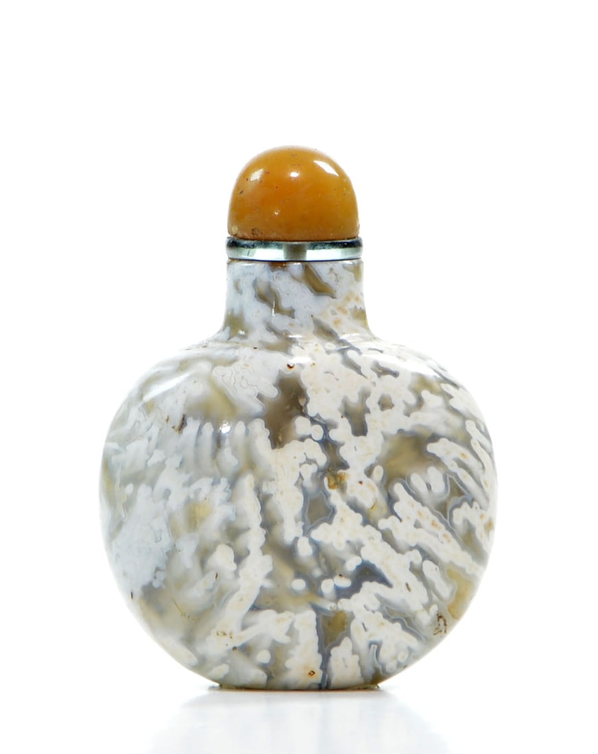SoldA Chinese Moss Agate Snuff BottleA Chinese Moss Agate Snuff Bottle A Moss Agate Snuff Bottle, 18th c./19th c. Qing period. Very well hollowed, the caramel colored stone suffused with dense moss-like green inclusions, hardstone stoppeSee Sold Price