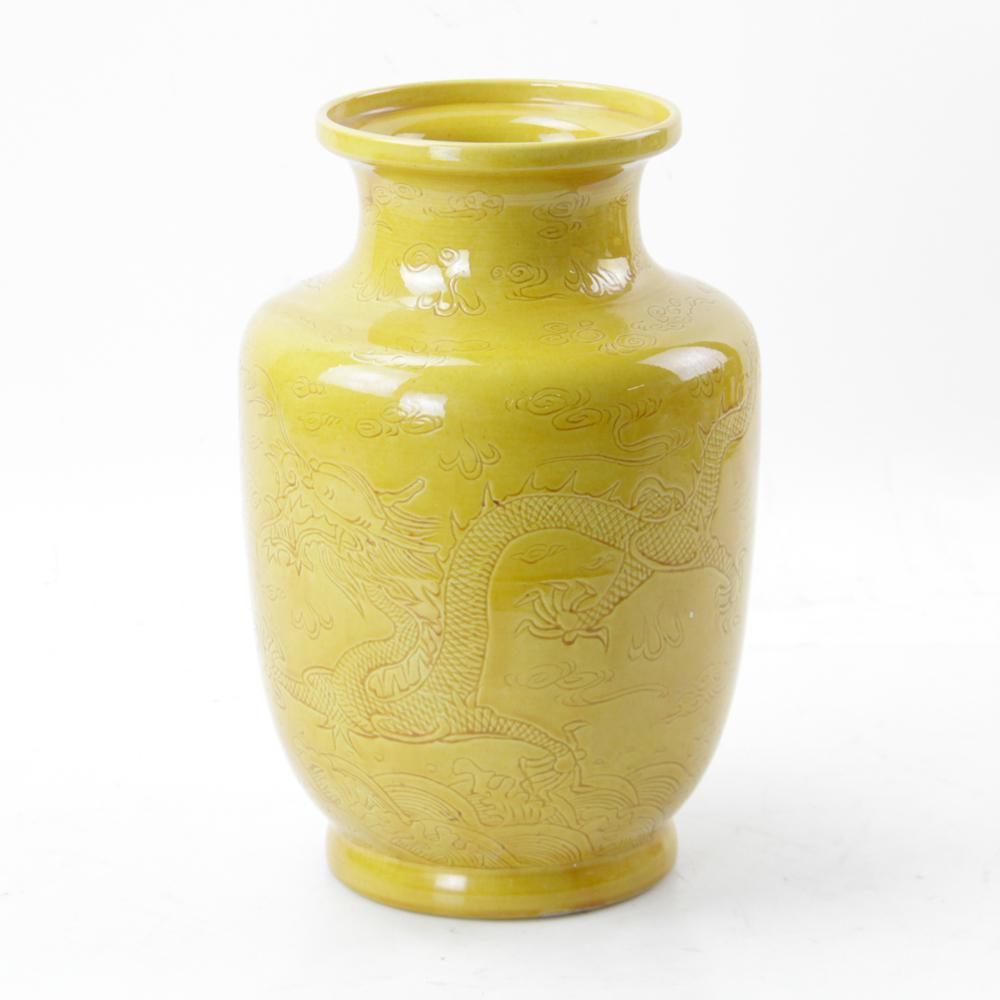 A yellow-glazed ornamental vase with carved dragon and phoenix motifs made during the QianlongFCL4.2(3)$7003 days Left