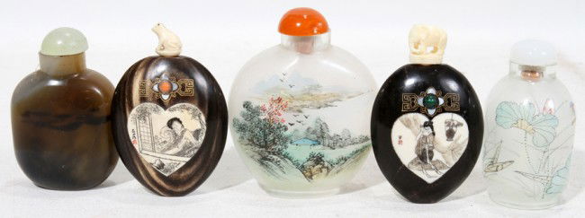 CHINESE ORIENTAL SNUFF BOTTLES, FIVE, H 2"-3"