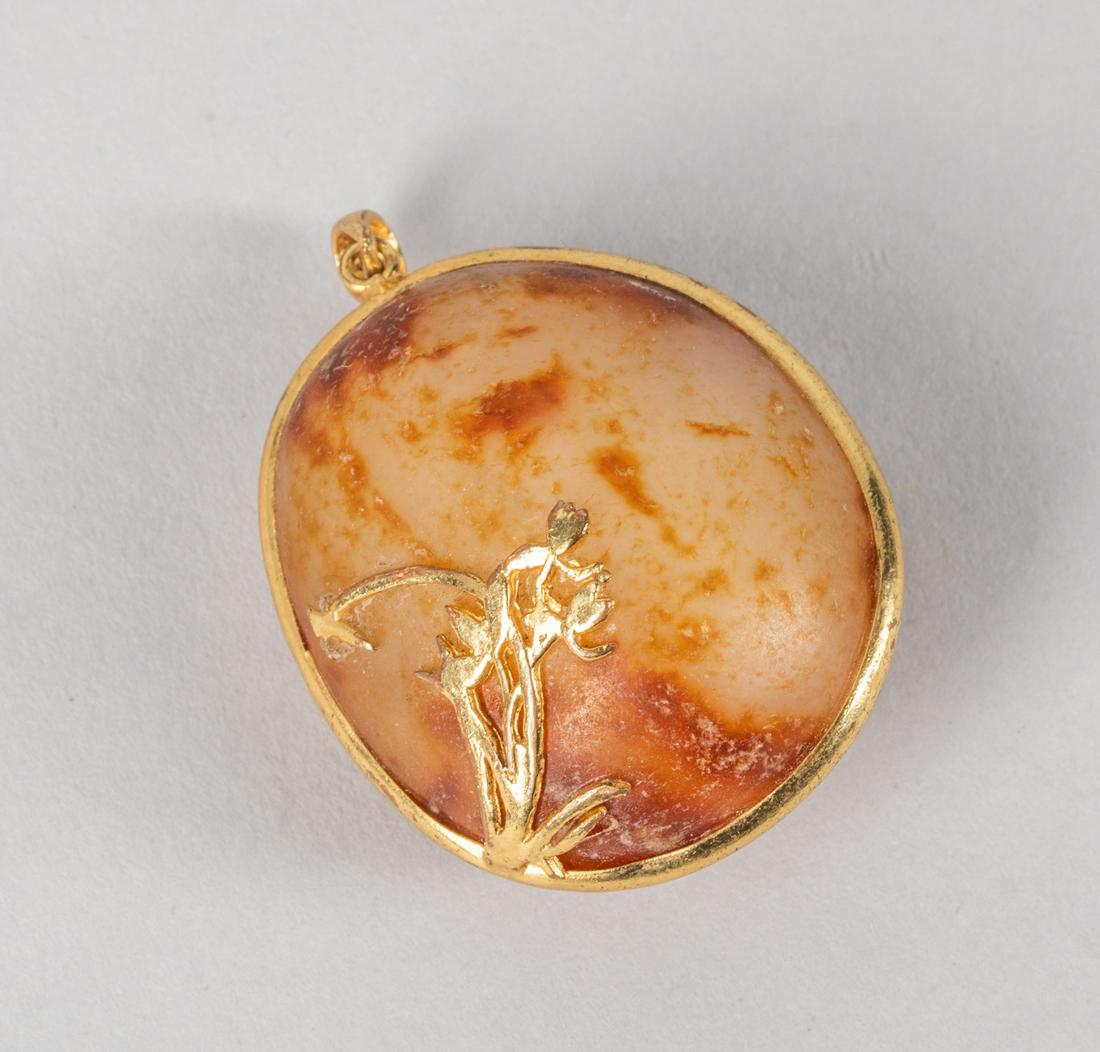 SoldRare Chinese White Jade Carving w/ Pebble NecklaceOf flattened chicken-heart form with an aperture at the centre, the front side carved in low relief with an archaistic beast among scrolls, carved in openwork with a stylized dragon at the top accentuSee Sold Price