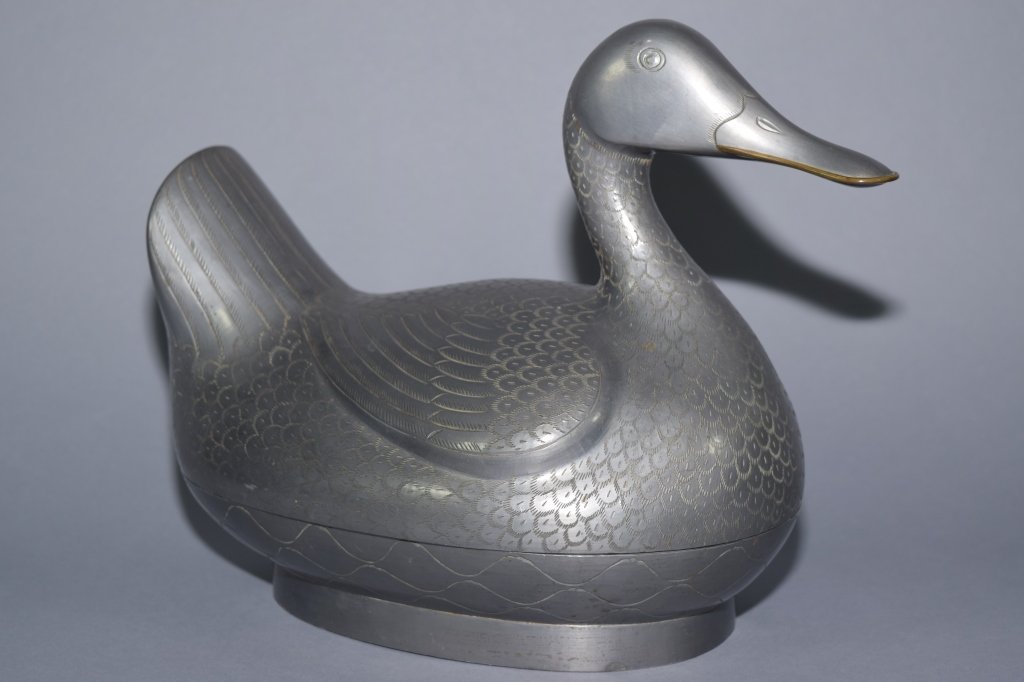 Chinese Pewter Duck Shape Box, Marked