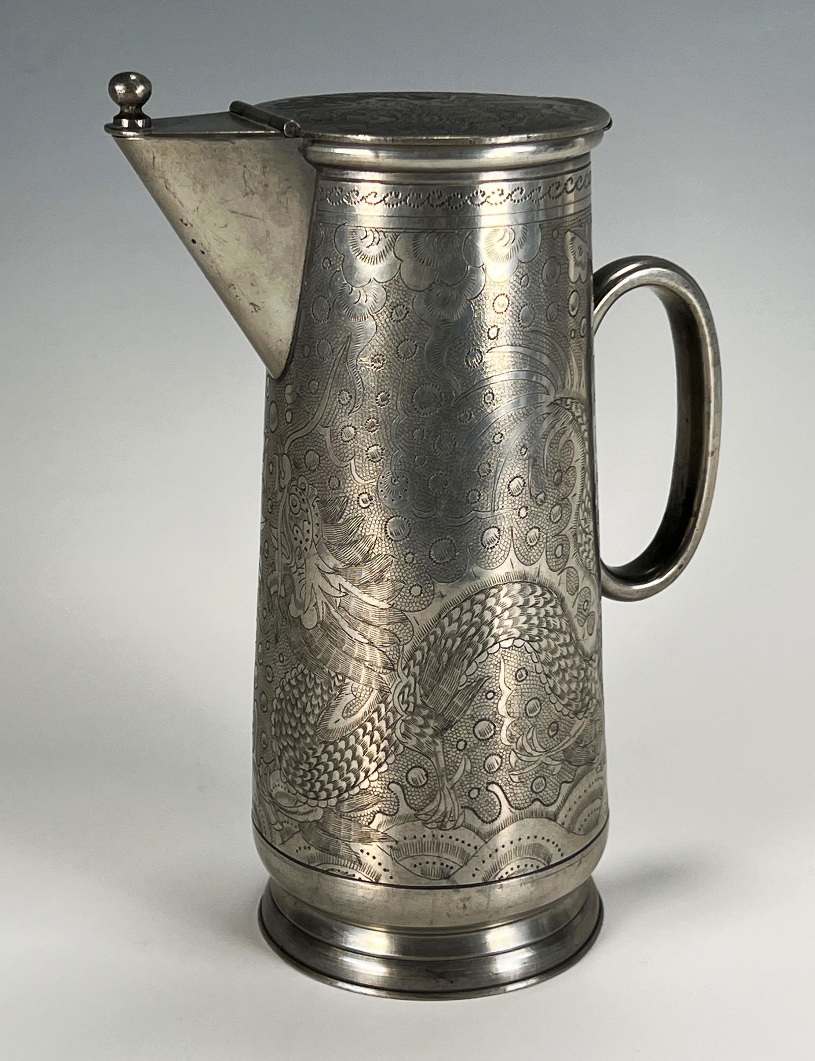 Victorian Silver-Plated Lidded Jug by Mappin & WebbVictorian Silver-Plated Lidded Jug by James Dixon & SonsJiujiang circa 1900 by Tu Mao Xing A late 19th / early 20th century Chinese export silver milk jug2 days LeftAn Exquisite Silver Dragon Pattern EwerMar 05, 2026An Exquisite Silver Dragon Pattern EwerMar 11, 2026A Rare Silver Figure and Dragon Pattern EwerFeb 28, 2026Ewer with lid China, early 20th century328 Lots AwayTiffany & Co. Antique Victorian Silverplate Repoussé Pitcher1 day LeftPhilemon Stacy Boston, Mass. early 19th century American silver water pitcher by rare Boston makerMar 01, 2026Hammered Sterling Silver Water Pitcher by International Silver circa 1920sFeb 28, 2026A pewter spire flagon Probably 18th centuryA Huge Silver Dragon Pattern EwerMar 11, 2026AMERICAN PEWTER WHALE OIL PETTICOAT LAMP.3 days LeftA Rare Gilt Silver Dragon Pattern EwerMar 14, 2026Handmade Italian 800 Silver Hammered Water Pitcher 6 InchesFeb 28, 2026An Exquisite Silver Dragon Pattern EwerMar 14, 2026