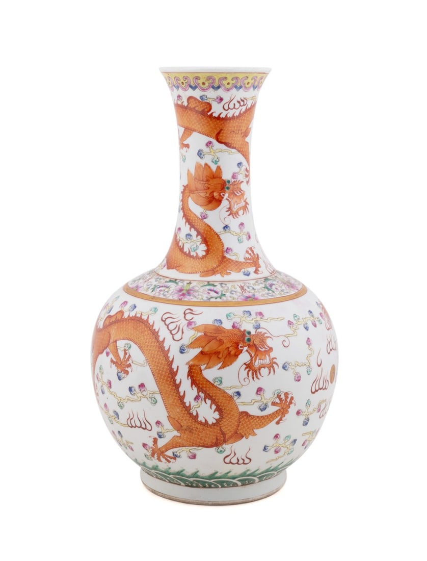 CHINESE POLYCHROME BOTTLE VASE WITH DRAGONS