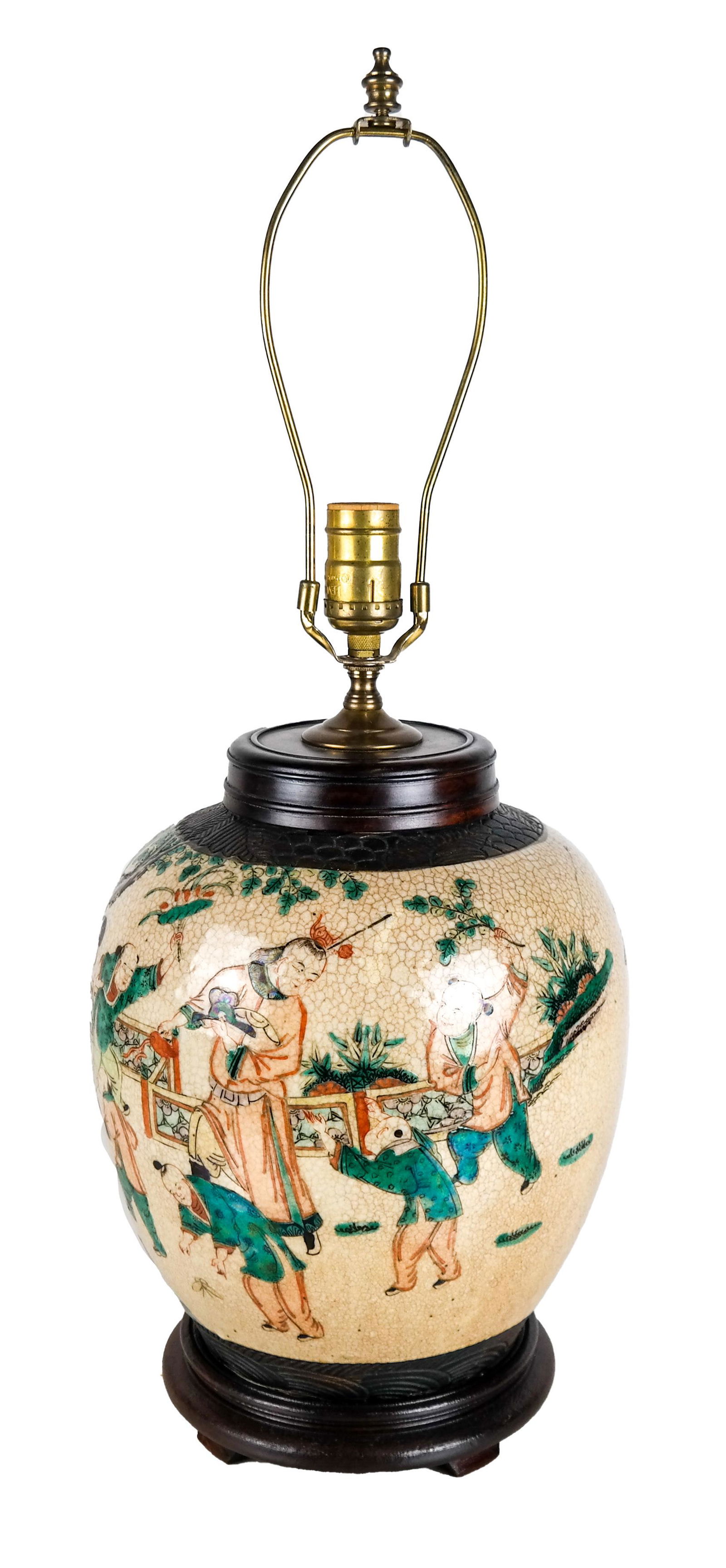 SoldChinese Polychrome Glazed Ginger Jar LampChinese polychrome ginger jar, as a lamp, with figural decoration and incised wood "collar", with hardwood base and lid. [25 inches to top of finial].See Sold Price