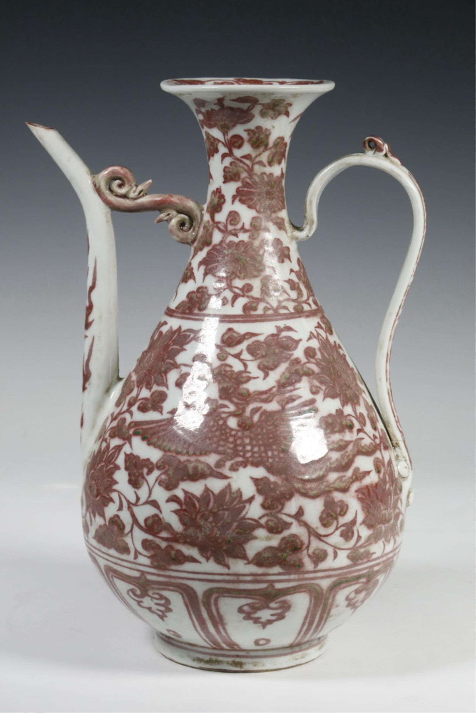 A Chinese Ming Style Porcelain Covered EwerA Chinese Ming Style Porcelain Covered Ewer. With an underglaze copper red foliate motif throughout, bearing a six-character Ming mark at the shoulder Height: 15 1/4".See Sold Price