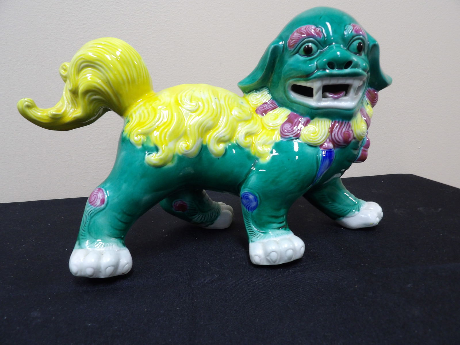 SoldChinese Hand Painted Porcelain Foo Dog StatueChinese Hand Painted Porcelain Foo Dog Statue w Baby Foo Dog at its Feet. Damage to tail. Measures 18 x 7 x 6 inches.See Sold Price