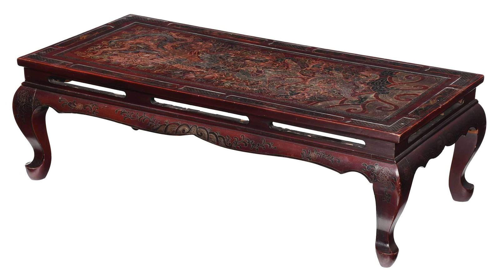 Chinese Red Lacquer and Polychrome Leaf Decorated Low Table